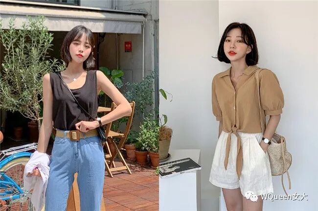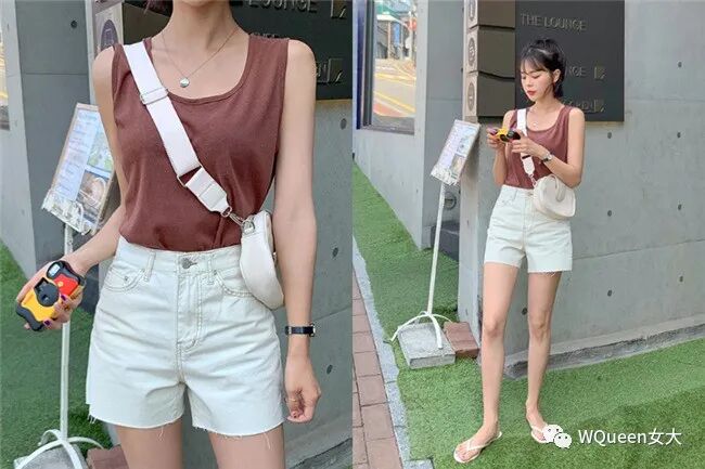 如果上衣是深色的背心,下身可以配着浅色系的五分裤,看起来会让你更有消暑感,带条小巧的项链来点缀锁骨,或是选择斜背相机包来搭出层次感,充满清爽质感,看起来好像学生一样!