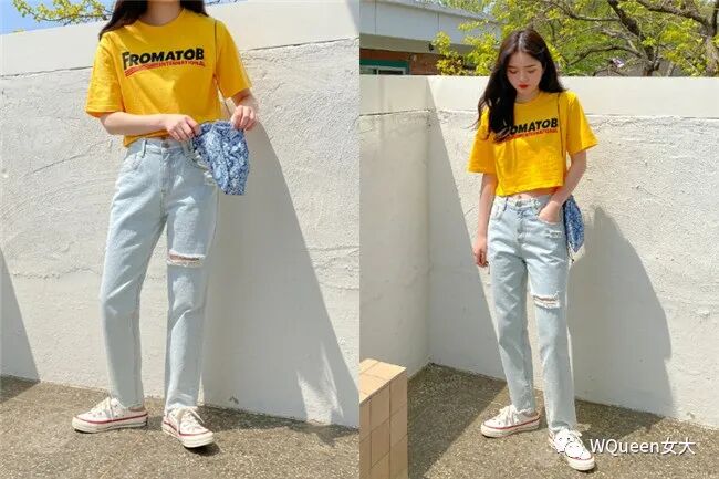 人人衣柜里都有的T恤、直筒裤就是最好的搭配法!要避开邋遢或是没精神的感觉,在夏季可以选择亮色系的短T配直筒裤,让你整个人可以看起来更有活力,俏皮可爱。