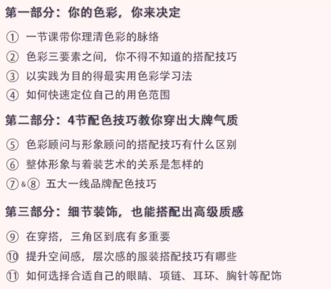 再次,老师把色彩讲得深入浅出,我是边照着镜子边听完课的,分析了自己的情况,比如我属于暖色人,柔和人,肤色和发色的对比度为中高,后悔没早知道这些,不然我真不至于花那么多冤枉钱试错。