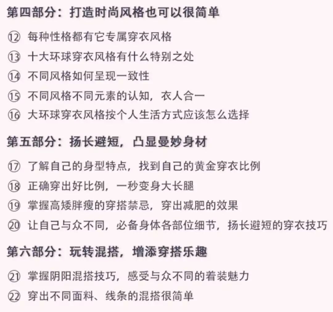 课程先从色彩理论开始,定位自己的用色范围,分析国际大牌的配色技巧,如何选择眼镜、项链、耳环等配饰,怎么确立自己的穿衣风格,达到人衣合一的境界,找到自己的黄金穿衣比例,让自己扬长避短又与众不同。