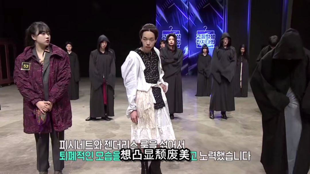 一头银发,刘海遮眼,把浪漫与高雅的无性别穿搭贯彻到底的姜世俊,就属于人群中最亮眼的那个。