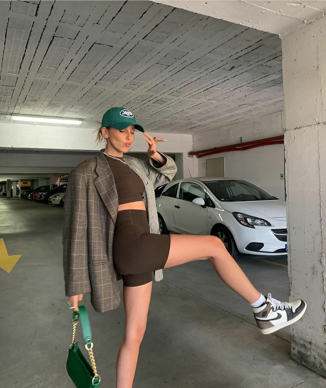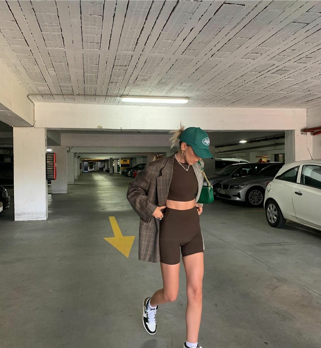 Sofia Coelho的深棕色legging和crop top以紧身的设计充分包裹肌肤,不同的身材穿上都是显瘦利器,毕竟这样运动服在视觉上总是起到提拉收紧肉肉的效用。