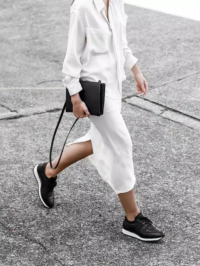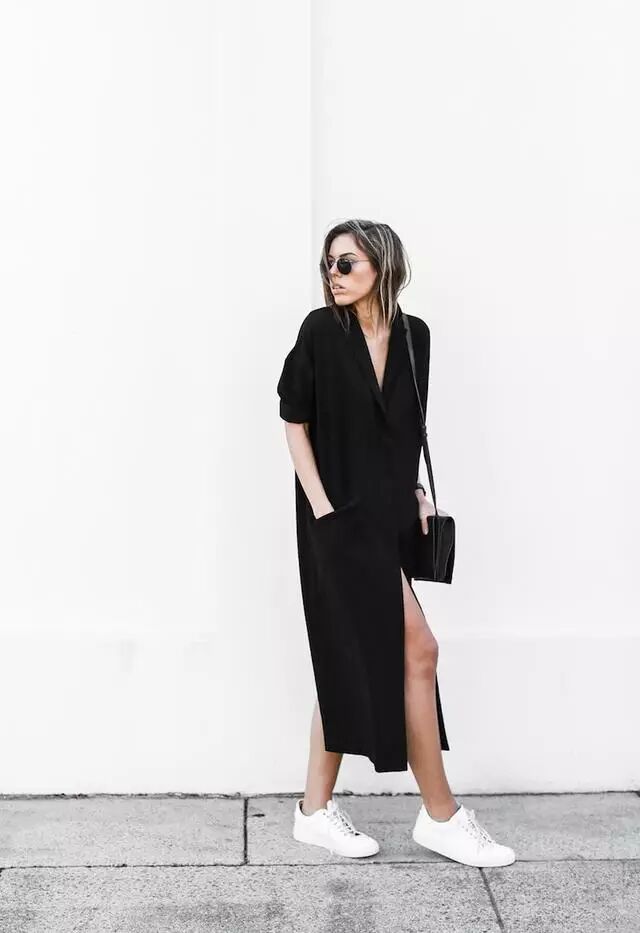如闪着光泽的黑色的尖头中跟鞋子,配上一条黑色的精致西裤和一件浅米色的高领短袖毛衫,一位职业女性的专业感觉悄然而出;白地彩色条纹的平底休闲鞋子,搭配黑色的印花t恤,下装就换上米色的纯棉含莱卡的及膝a字裙,整个人看起来格外舒适,还充满着阳光的气息。