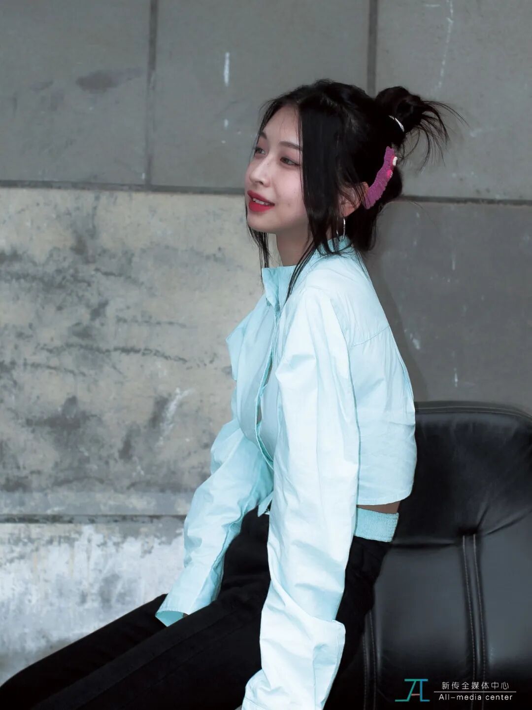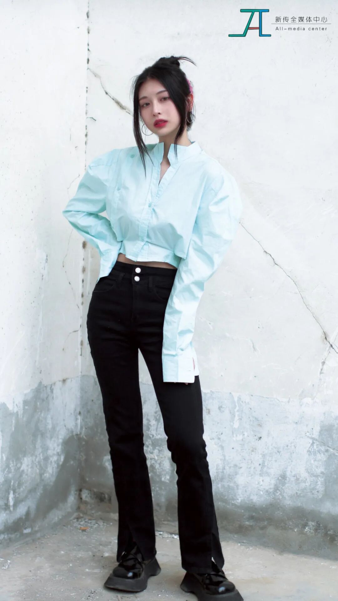 有设计感的泡泡袖衬衫加上黑色开叉裤