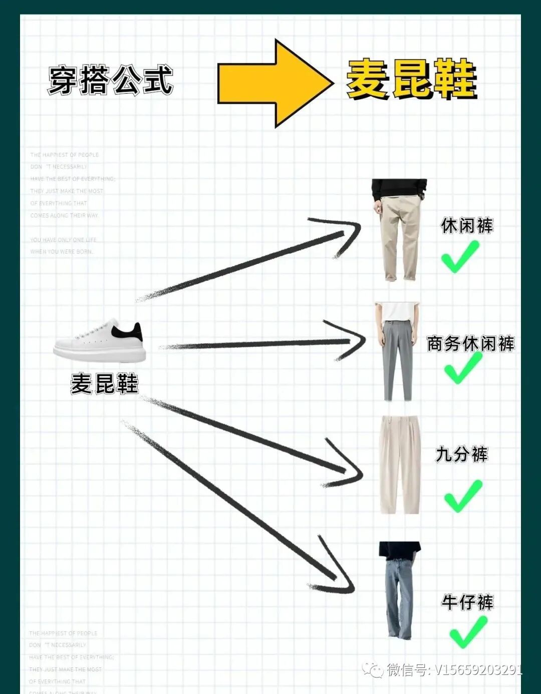 麦昆鞋也是一款百搭鞋,可以搭配西裤、九分裤、牛仔裤、商务休闲裤,可以根据自己的喜好和场合进行搭配。