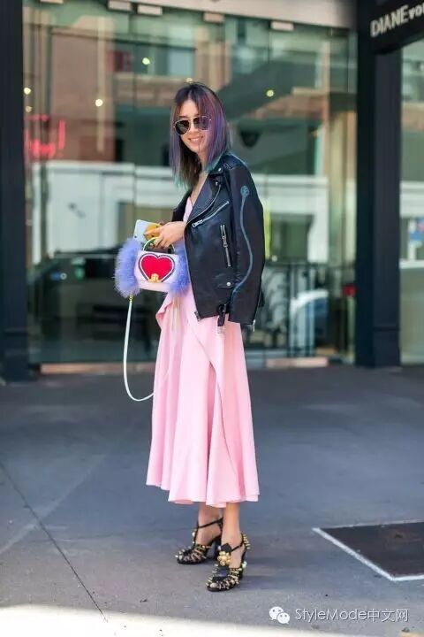 韩国相当知名的时尚时尚博主Irene平常也喜欢混搭的朋克风穿搭,以皮衣搭配上抢眼的粉红色长裙,以及用色大胆的配件,让人一看了就难以忘记。