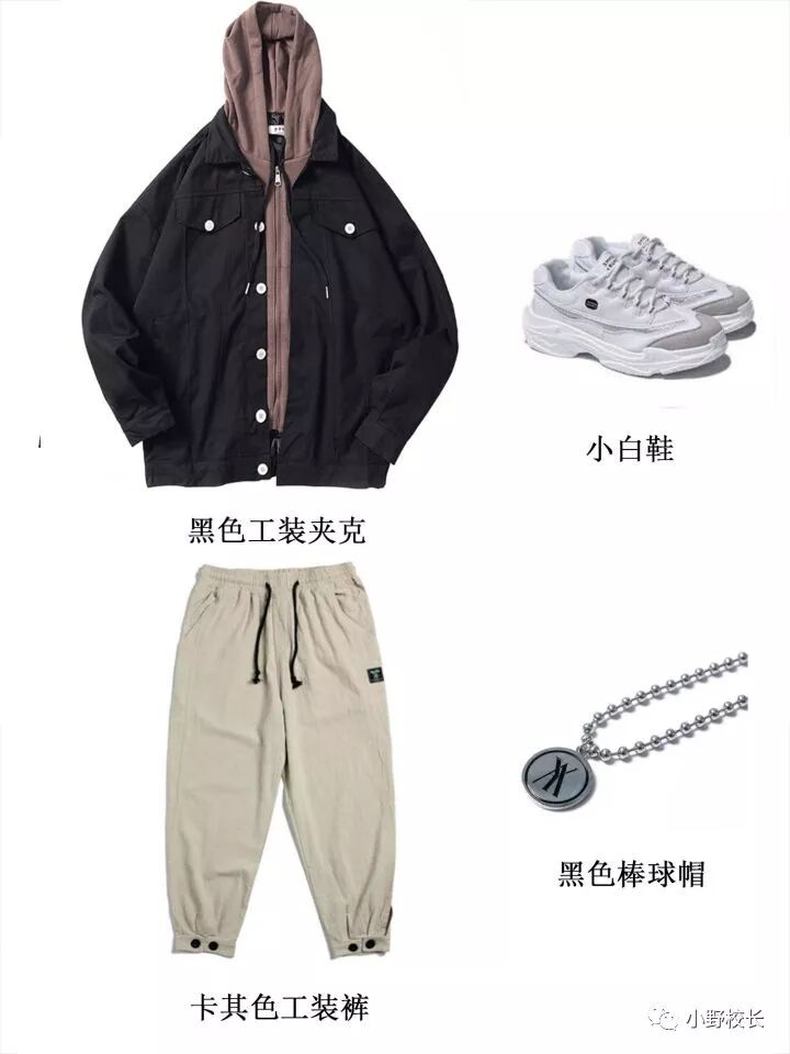 黑色休闲夹克+卡其色束脚裤+小白鞋+嘻哈项链