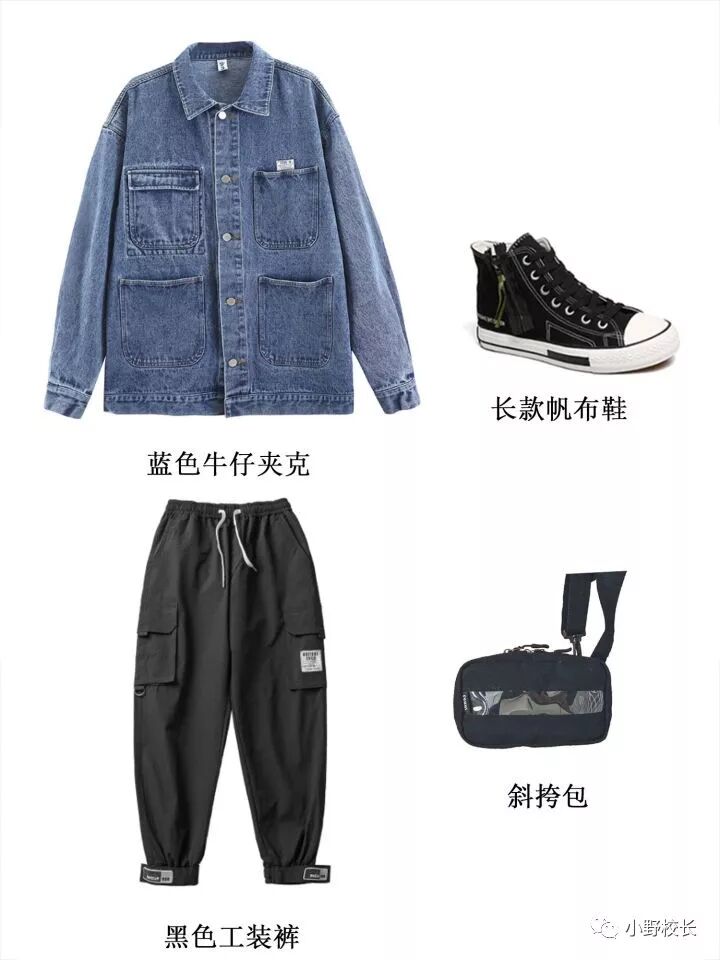蓝色牛仔夹克+黑色工装裤+高帮帆布鞋+斜跨包