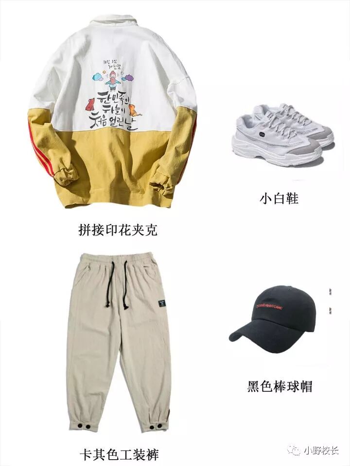 黄色印花夹克+卡其色束脚裤+小白鞋+棒球帽