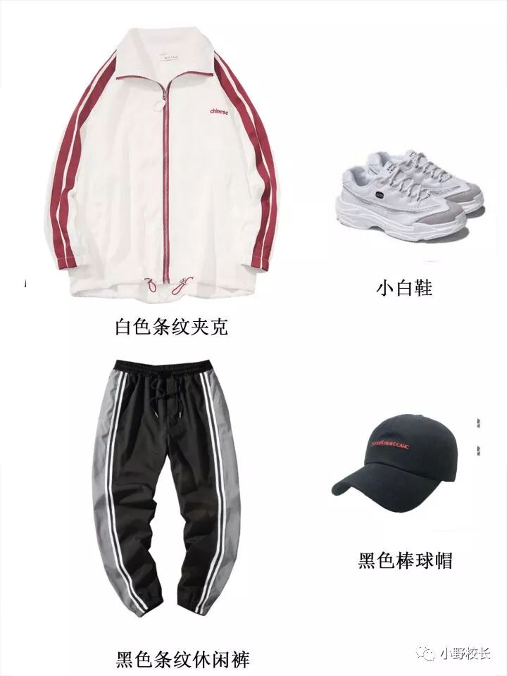 白色条纹夹克+休闲裤+小白鞋+棒球帽