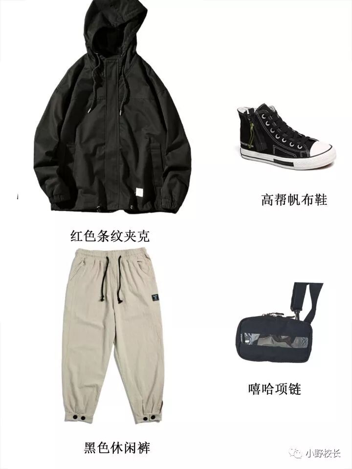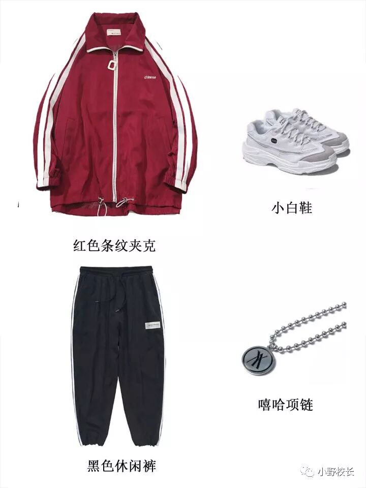 红色条纹夹克+休闲裤+小白鞋+嘻哈项链