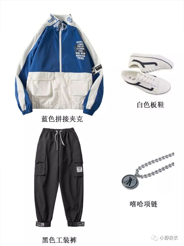 蓝色拼接休闲夹克+黑色工装裤+小白鞋+嘻哈项链