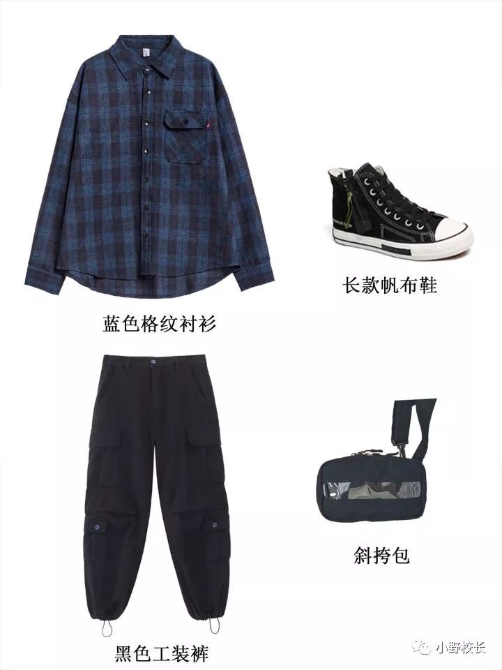 蓝色格纹衬衫+黑色工装裤+高帮帆布鞋+斜跨包