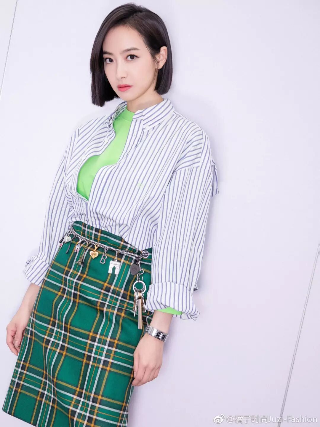 所以撞色和营造层次感,一定要乱的合理!叠穿可以选择一件有设计感的单品来强调主题,其余都要选择比较经典简单的基础款,比如纯色、格纹、条纹、牛仔元素等,撞色要注意是同一个色系,且要相互呼应。切记颜色不能太杂,比如她衬衣下搭配的是亮绿色t,裙子就选择了同色系的复古格纹裙,否则太过就会变成乡村非主流...