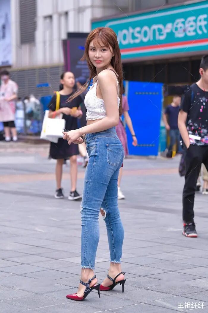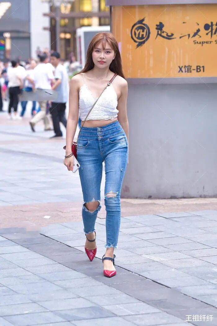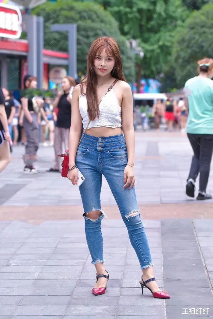 搭配:浅色破洞牛仔裤高腰设计