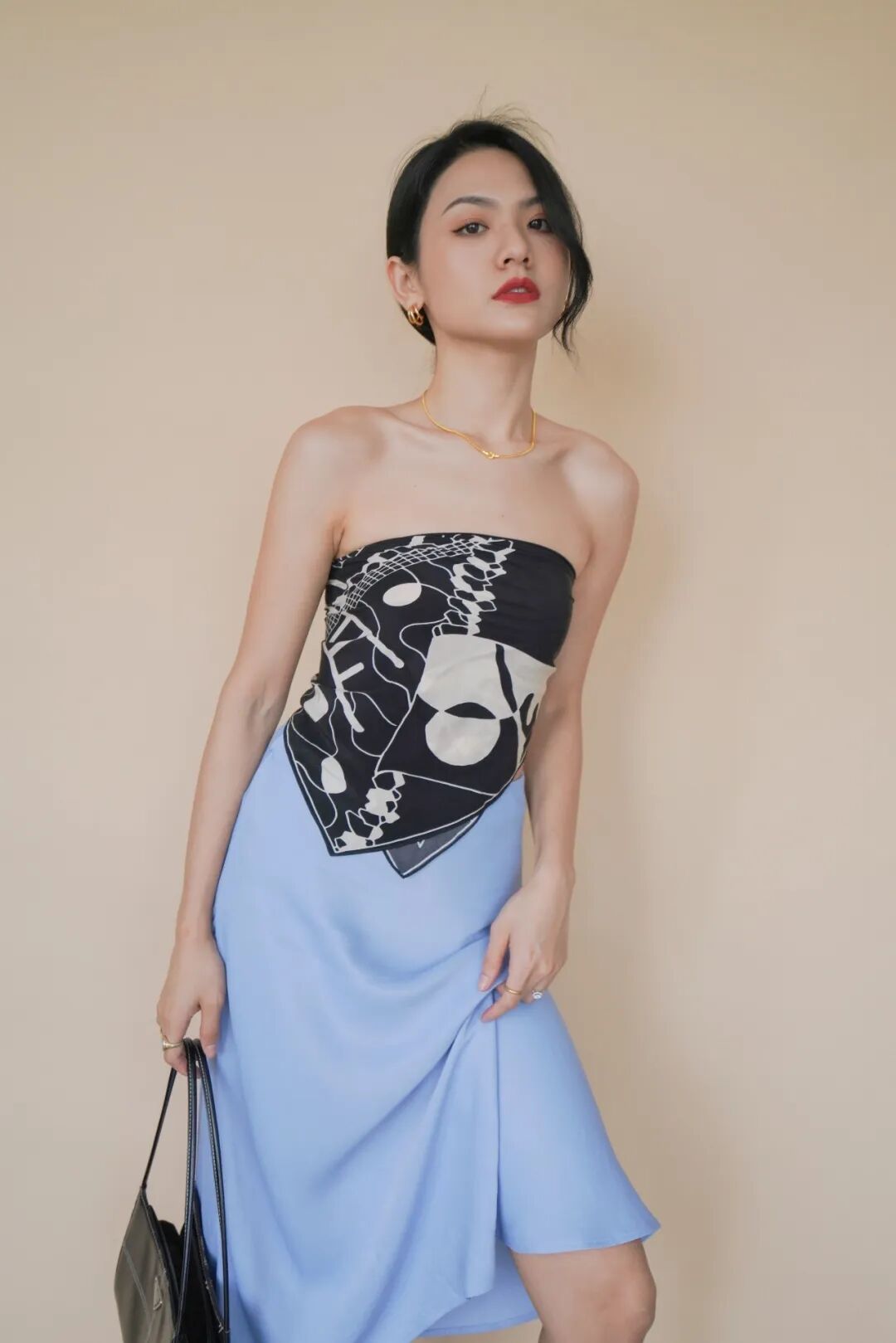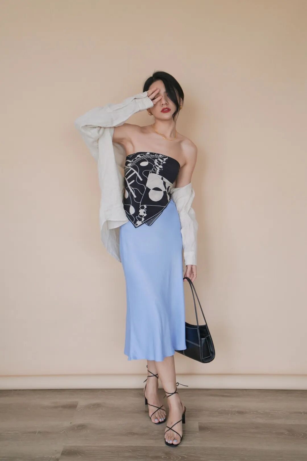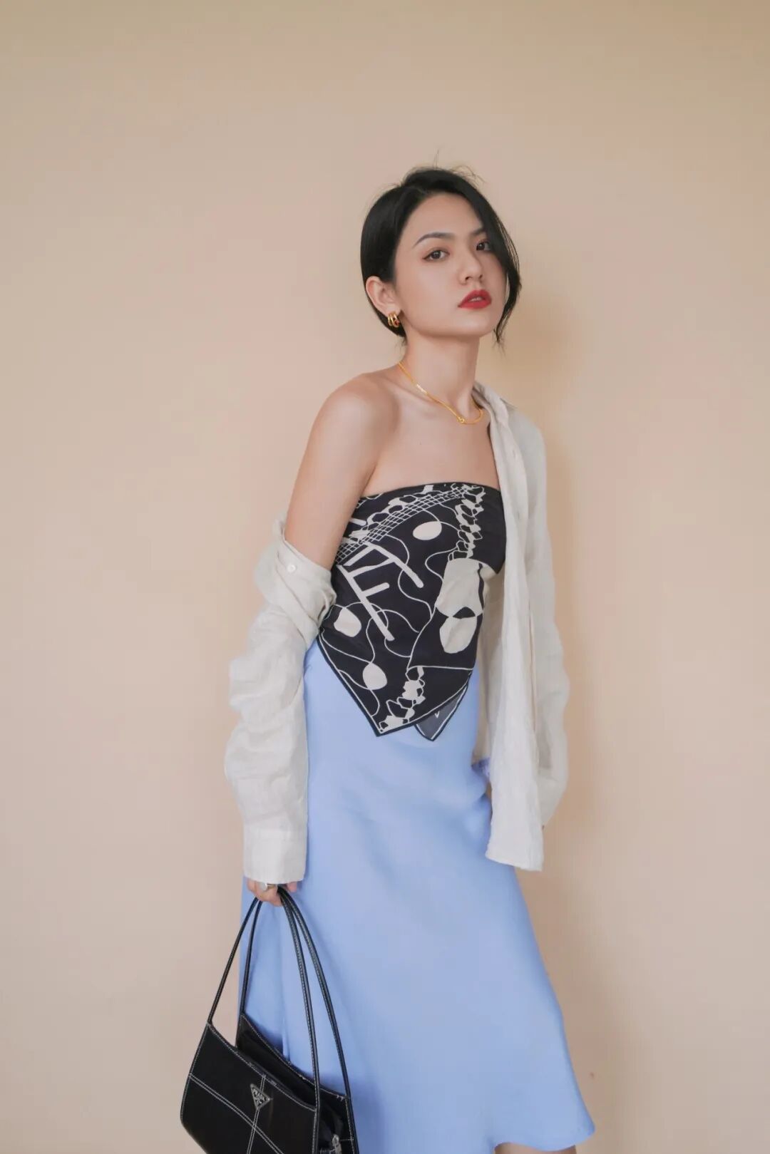 前两套都很日常,适合大多数人,第三套会比较的时髦和不日常一些。搭配了之前出现过的丝巾。我觉得丝巾真的非常的好用,一年四季都用得到,可以塑造特别多的造型。这次拿来绑成抹胸,会比普通的吊带和抹胸都更有趣。
