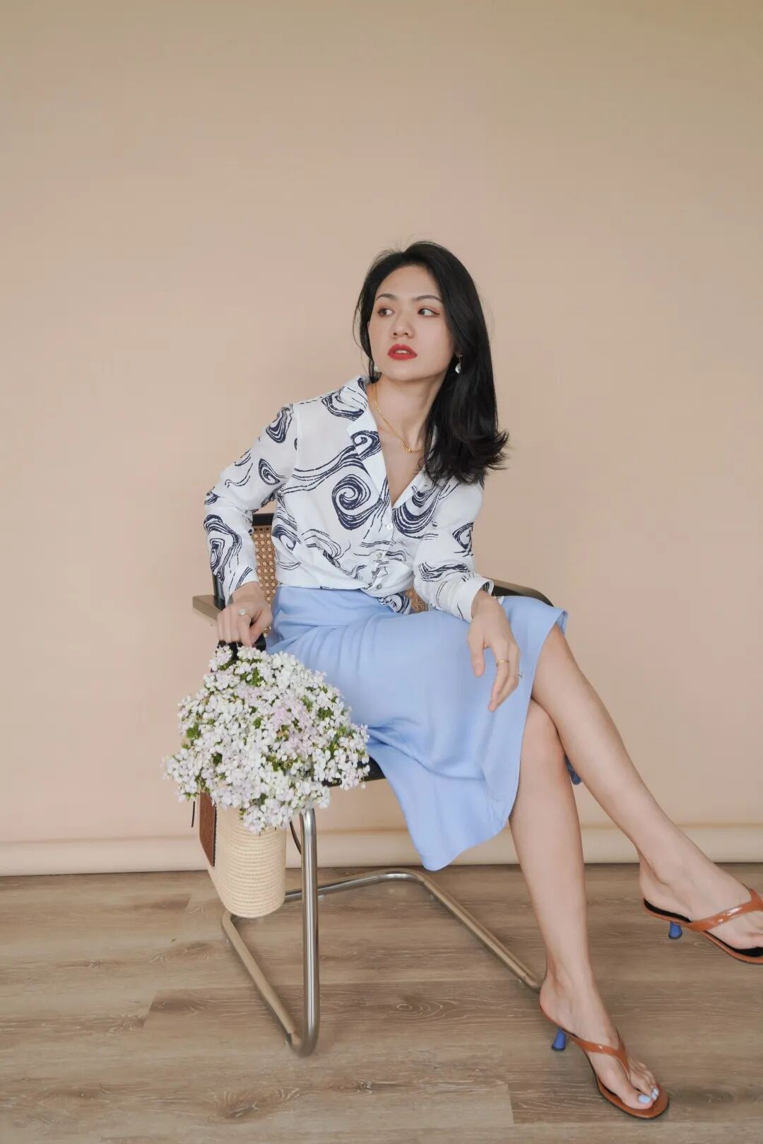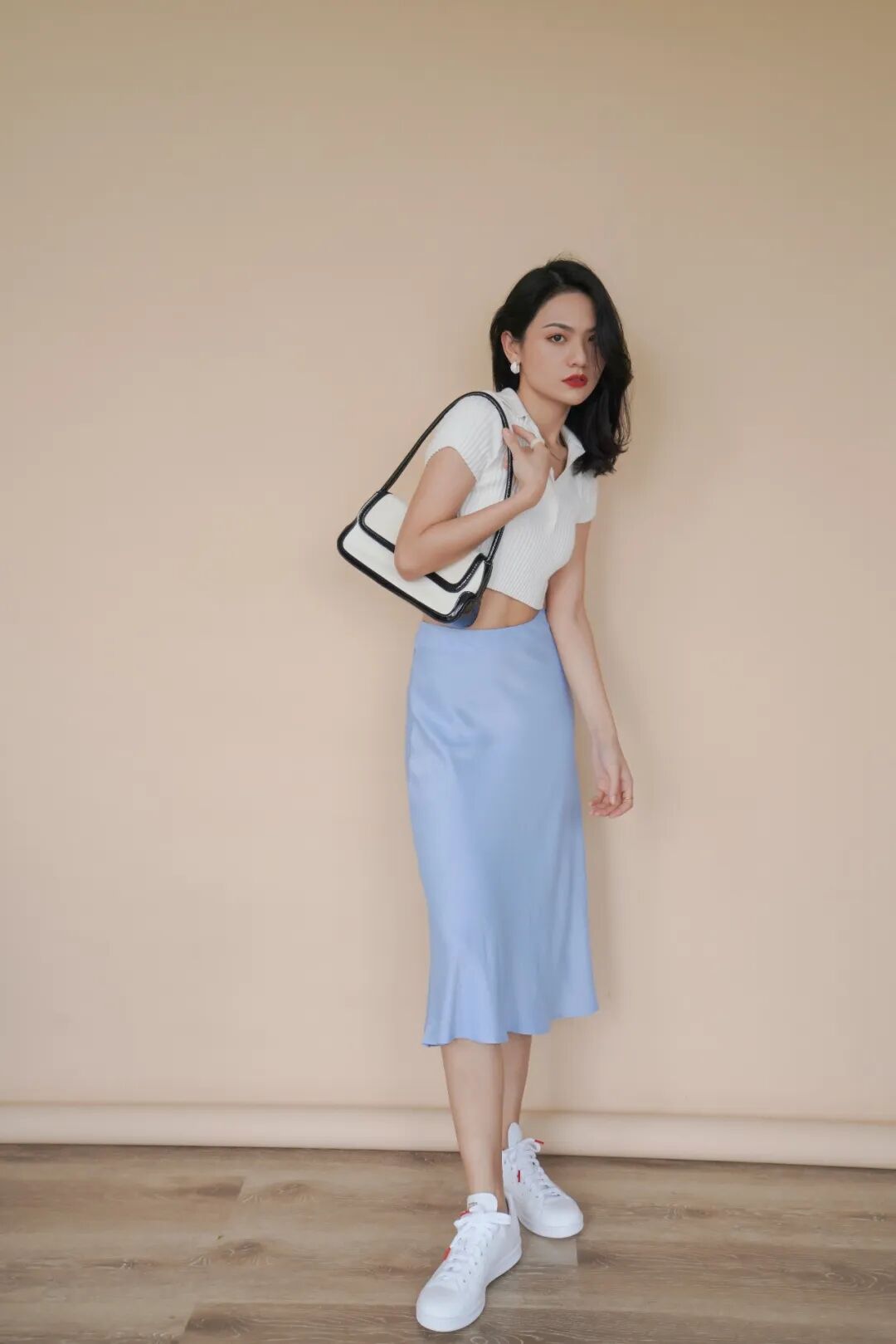 第一套搭配的是衬衫,我选的是白色的,因为白色能够提亮整套look,所以黑黄皮女生穿也会好看的。因为裙子本身是光滑面料加上是纯色,所以搭配这种有印花图案的衬衫会更有趣一些。