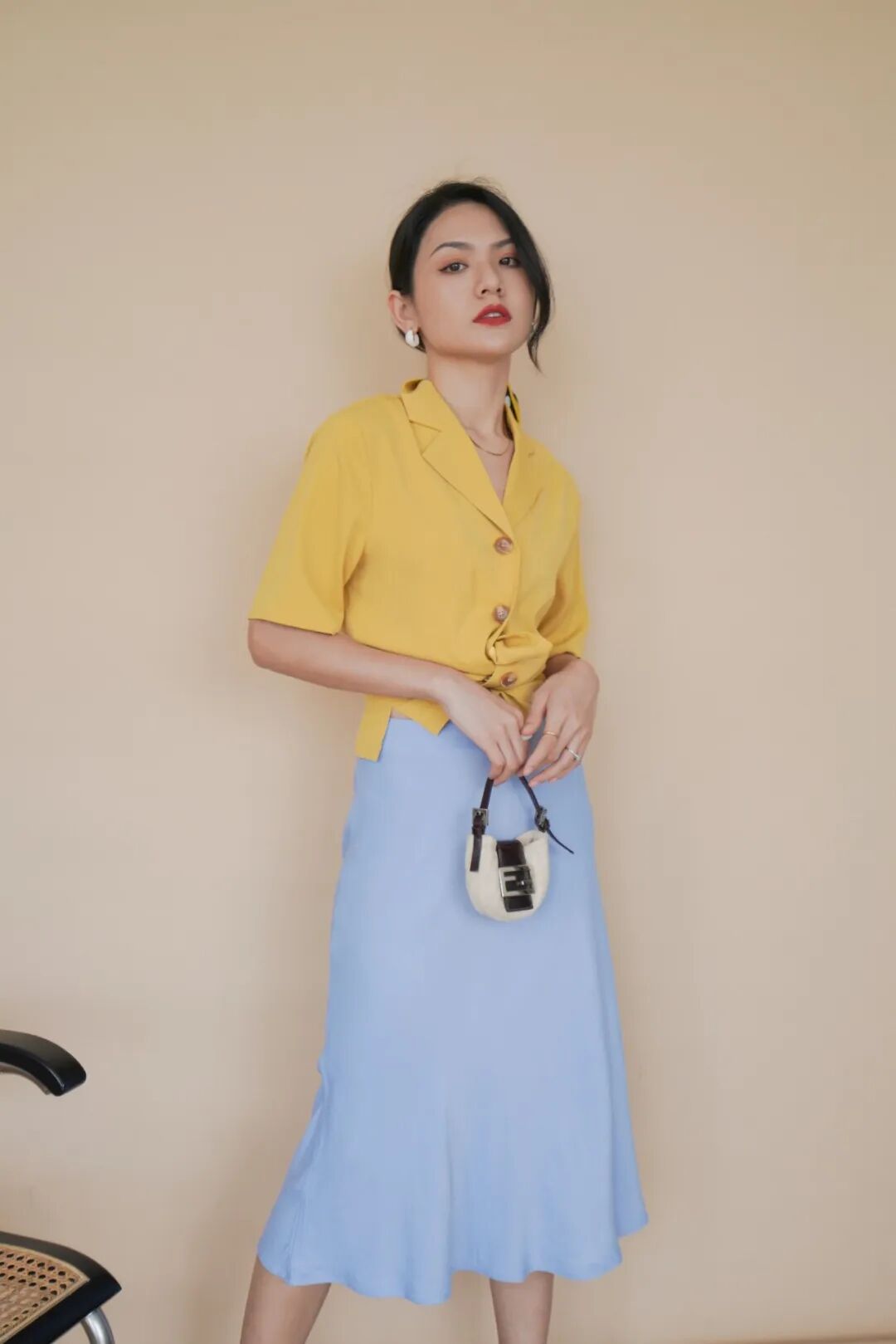 这一套是复古的风格,搭配了一件色彩更明亮的黄色衬衫。版型非常的90年代,感觉好像偷偷从我妈以前衣橱拿来穿的。蓝色和黄色组合起来都特别的抓眼球,色彩搭配也是造型好不好看很重要的一环。
