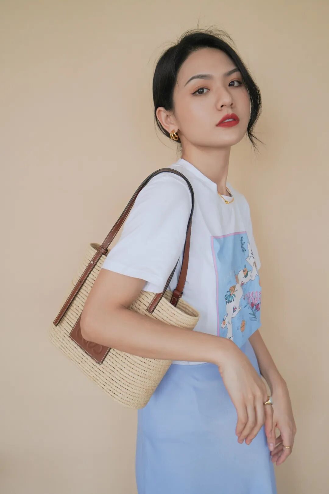 包包还是Loewe的草编包,非常的百搭,可日常可度假。另外配饰上我还选了一个发夹把头发夹起来,风格就变得些许女人味,综合T恤带来的少女感,这样呈现出来的风格也更慵懒和清爽,不费力的日常搭配。