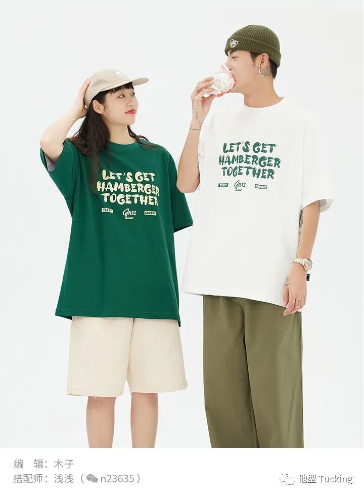 女生T恤为墨绿色,男生T恤的印花颜色正好与女生T恤的颜色相呼应,虽然为同个款式一看就是情侣装,但是印花不同,有相互间的色彩呼应也是一种情侣装穿搭技巧。