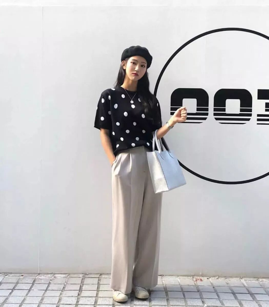 搭配波点T恤和浅色阔腿裤,敲级减龄