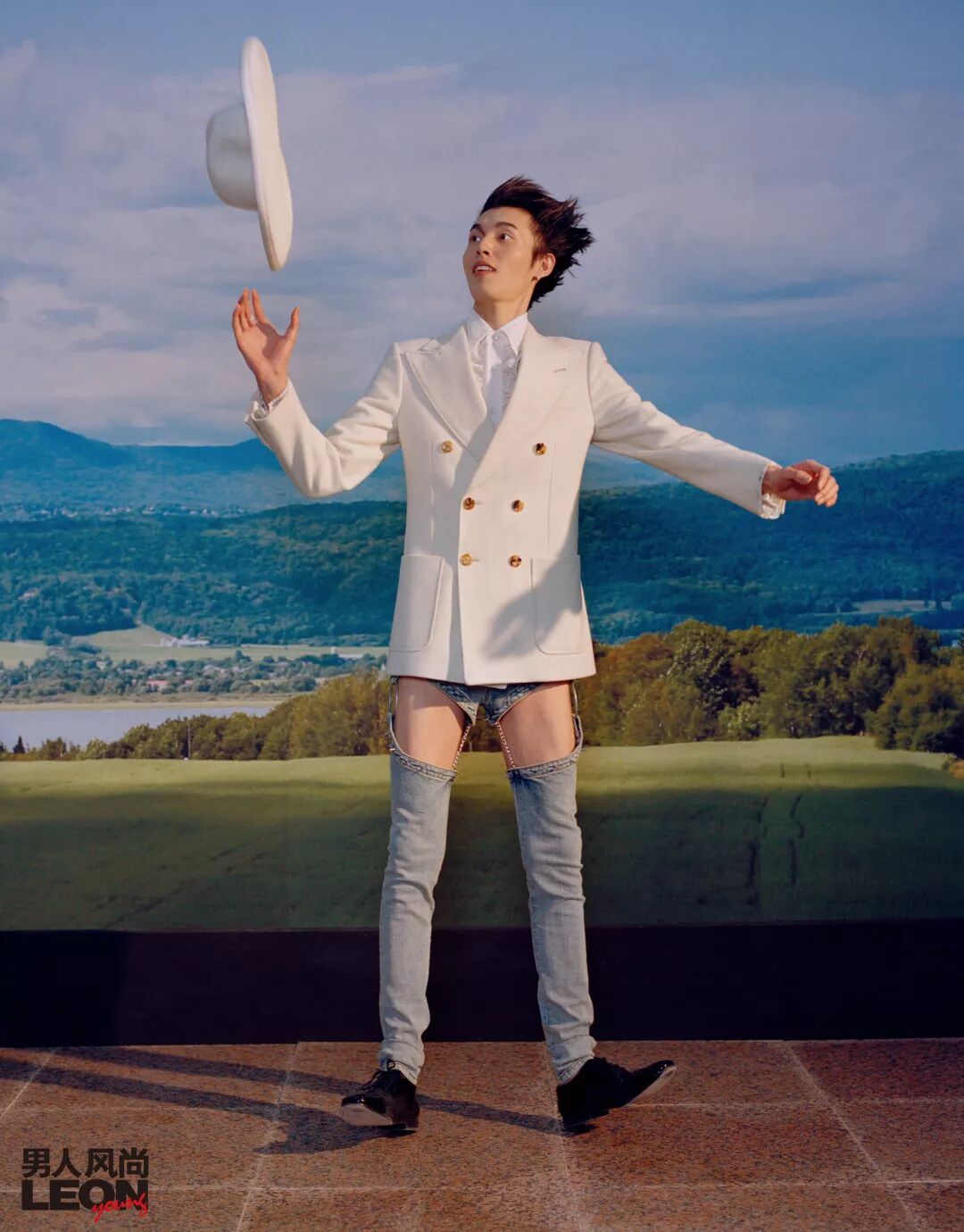 白色宽檐礼帽 / 均为 Gucci 黑色皮鞋 / Jimmy Choo