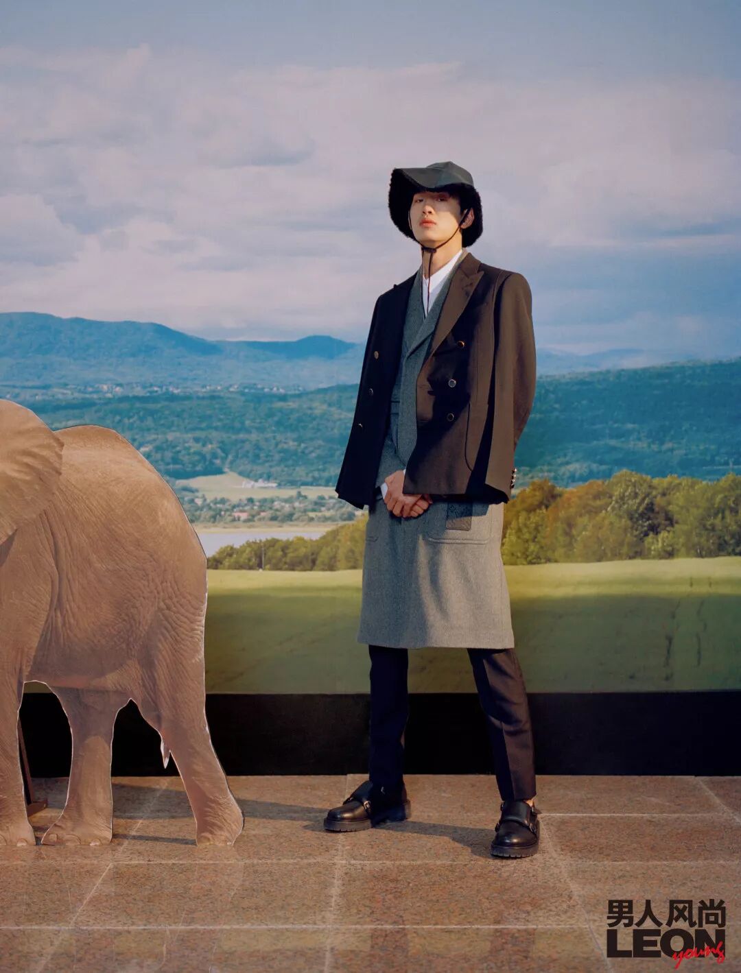 刘治成●黑色短款西装,灰色毛呢长款大衣,白色长袖衬衫,黑色西装裤,黑色皮质渔夫帽 / 均为 Louis Vuitton 黑色皮鞋 / Bottega Veneta