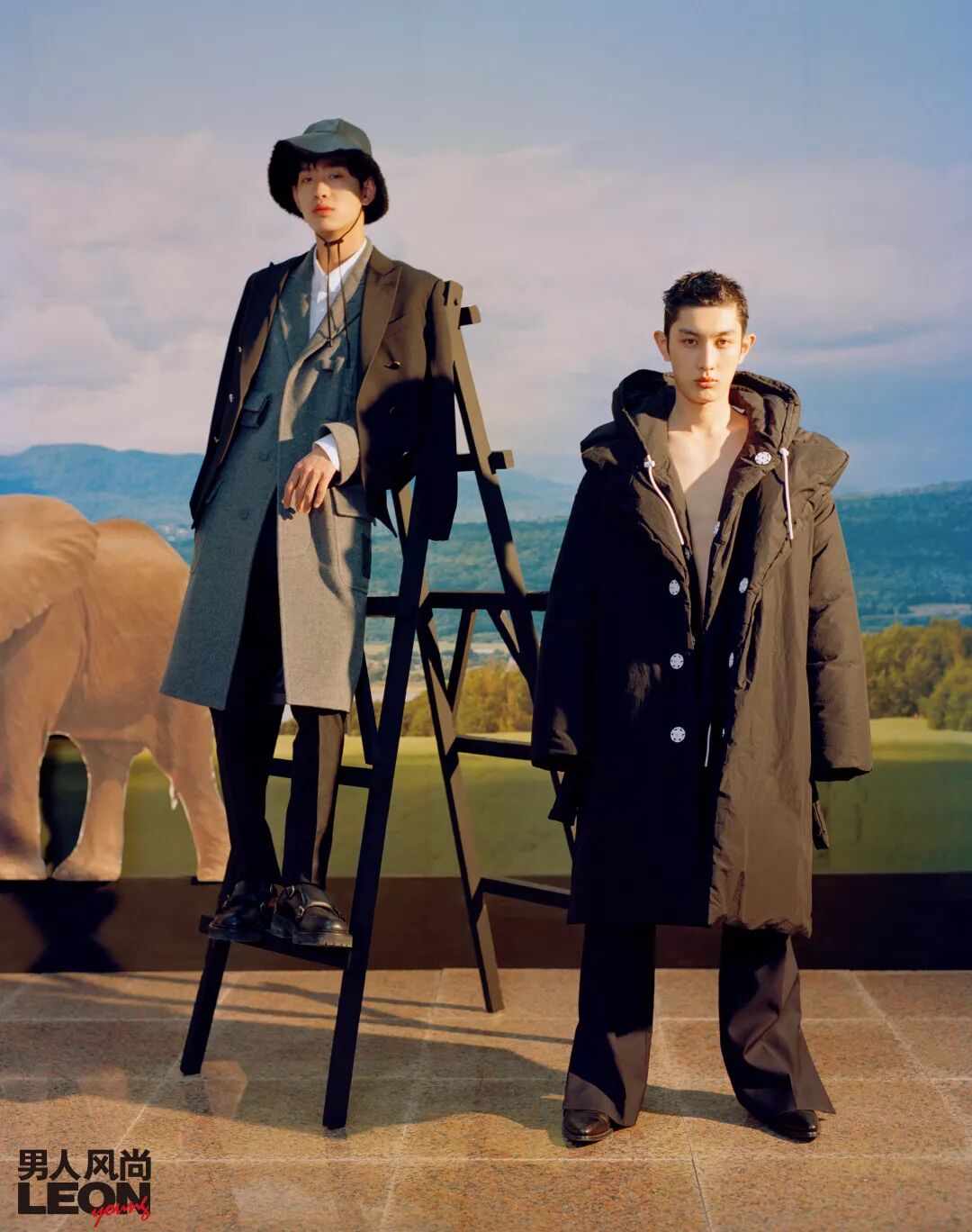 李昊男●黑色皮质连帽夹克,黑色长款皮裤 / 均为 Hermès王弘宇●灰棕色短款飞行夹克,墨绿色短裤 / 均为 Hermès
