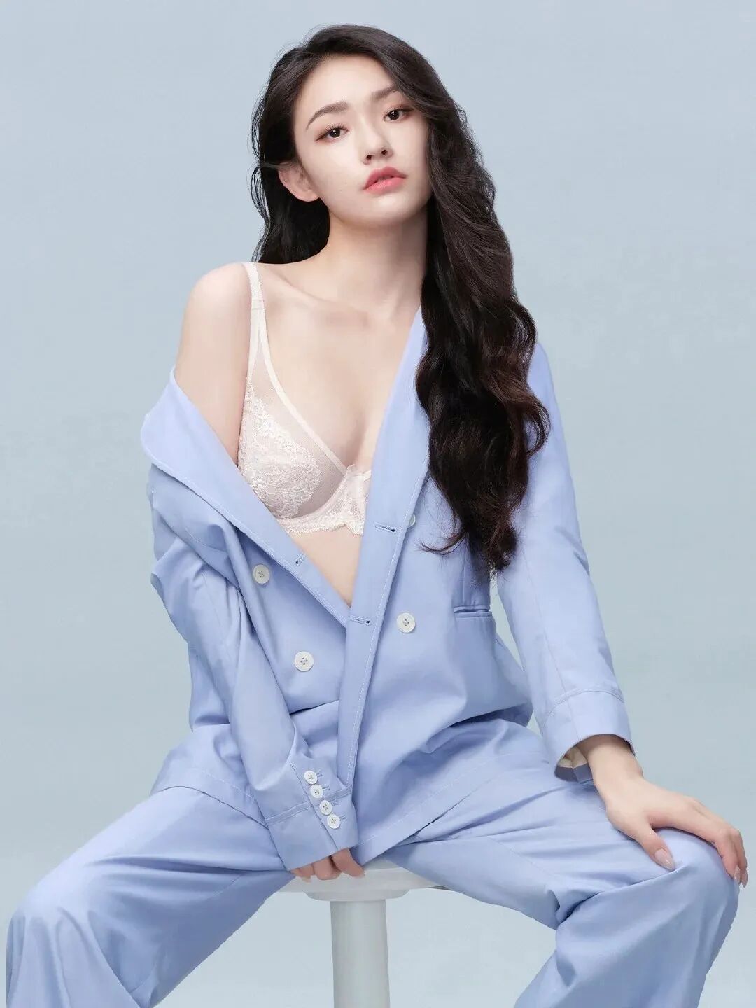 她乌黑的长发自然垂落,与浅蓝色的西装形成鲜明的色彩对比,更加凸显出她的肌肤白皙。精致的妆容和明亮的眼神则为整个造型增添了一抹光彩,使她看起来更加迷人动人。