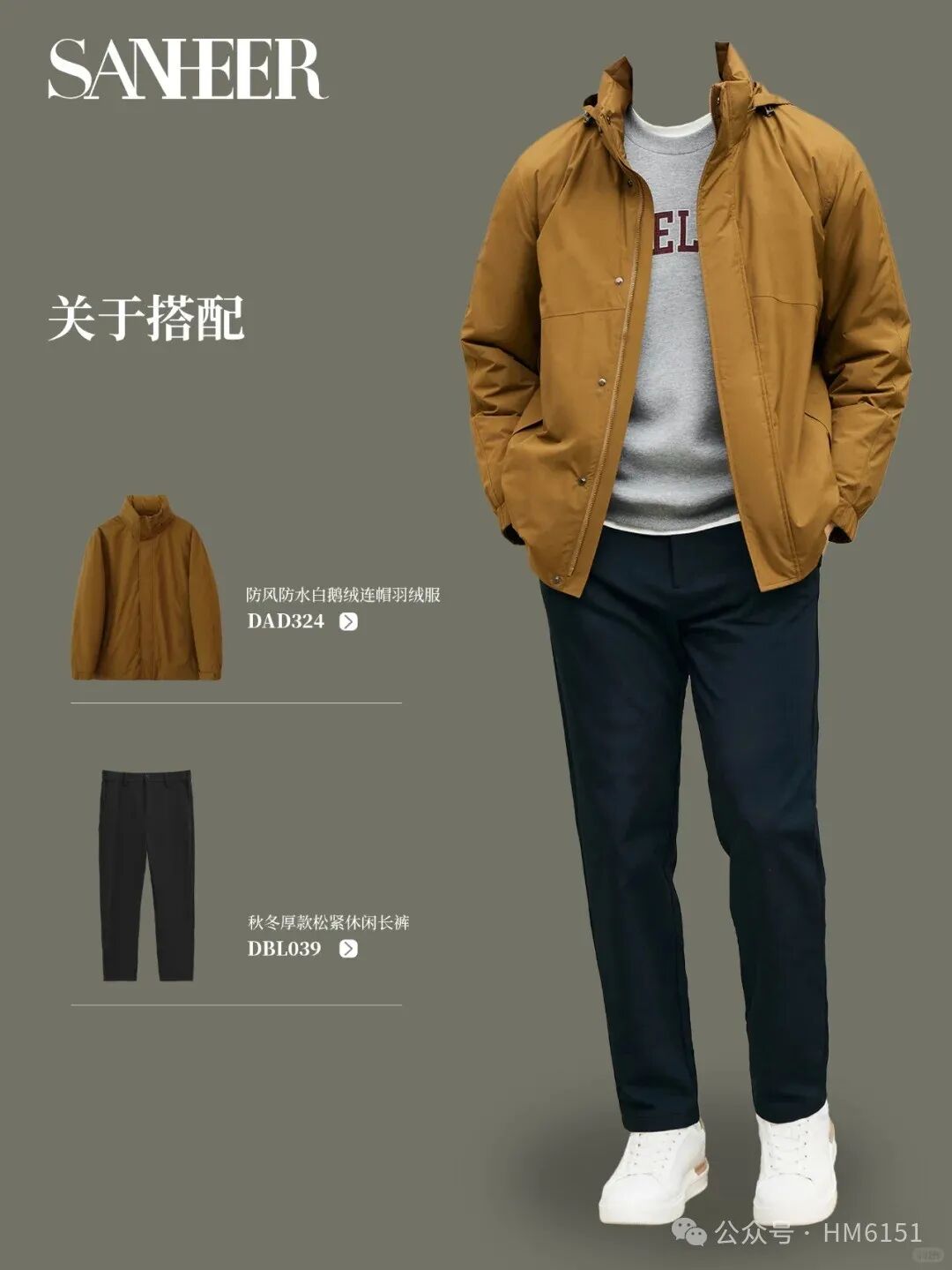 🌟第二套:姜黄色防风防水白鹅绒连帽羽绒服+灰色圆领卫衣+藏蓝色直筒休闲裤+小白鞋
