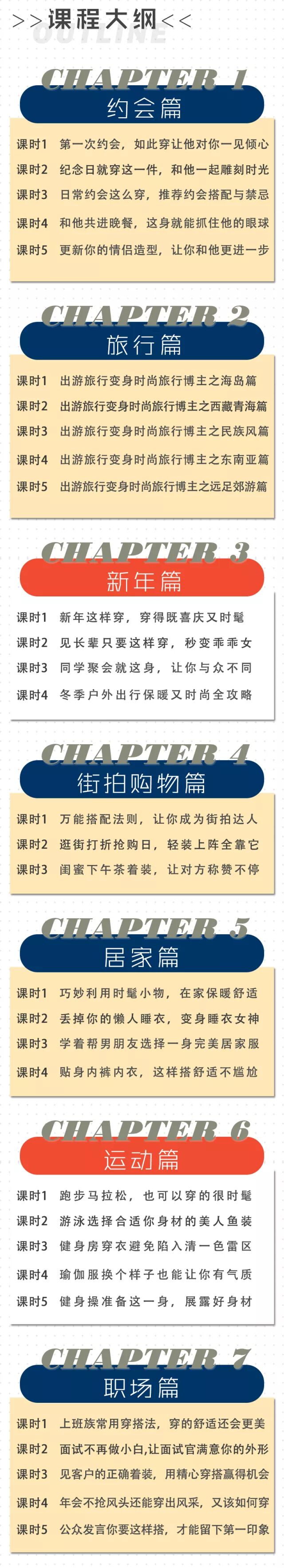 这套课程覆盖了居家,职场,旅游,约会等31个不同的场景,为大家提供全方位的穿搭指南。