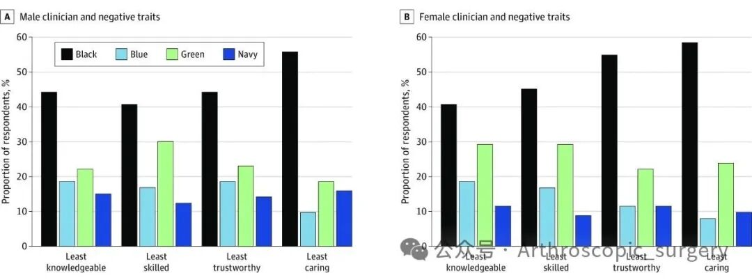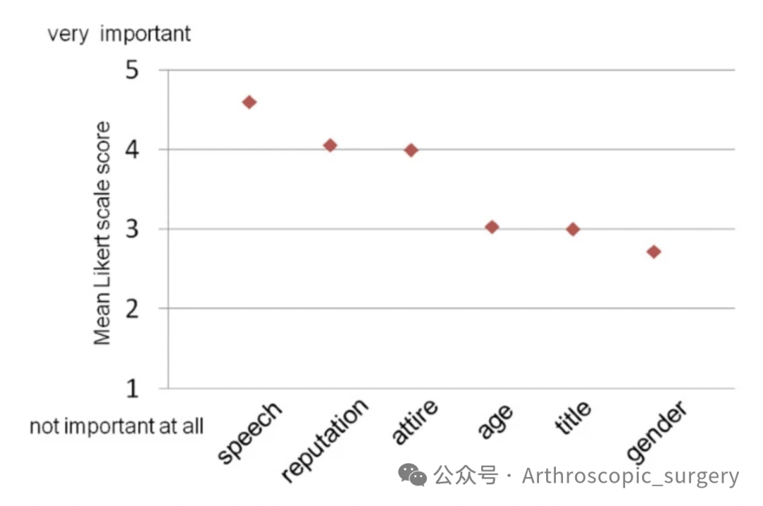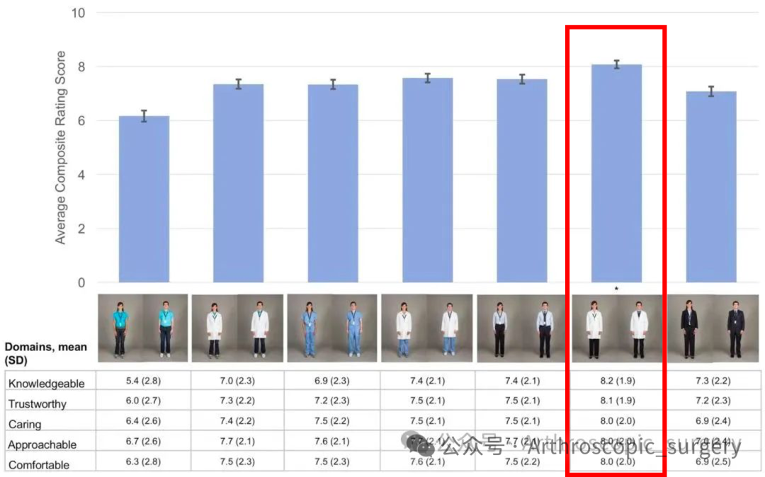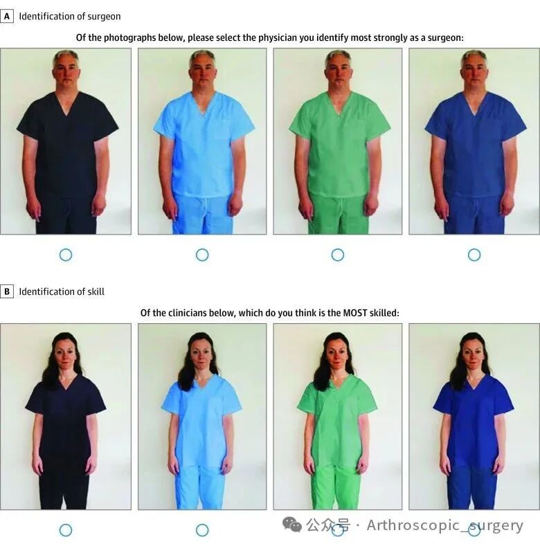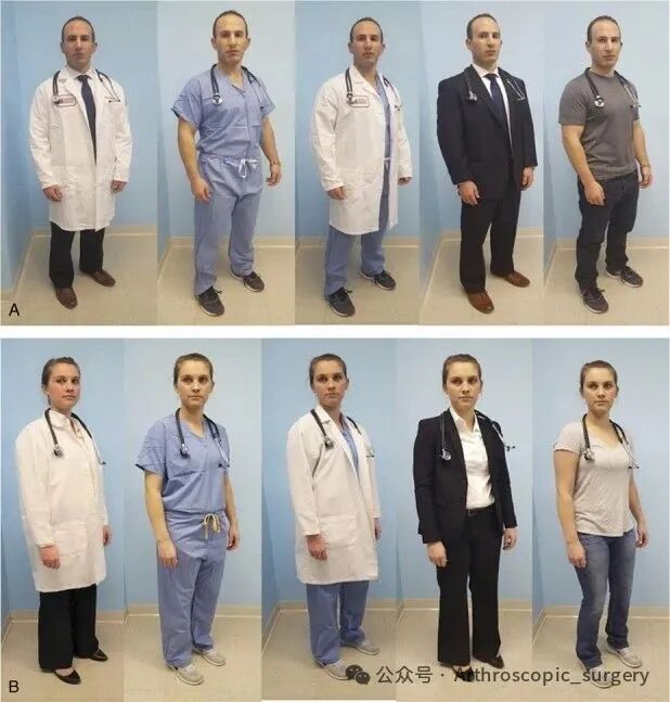 之前都是对于医生这个群体来进行的调研,那对于骨科医生而言,是不是有不同的结果呢?随后的有研究将重点放在了骨科医生上,对比了不同性别的骨科医生分别穿着白大褂内搭洗手服和正装,以及不穿白大褂的情况下只穿洗手服、正装及短袖T恤的患者反应。03 洗手服颜色调研