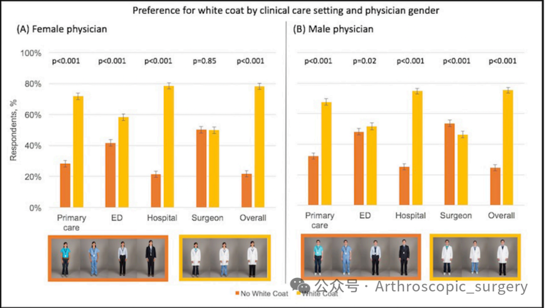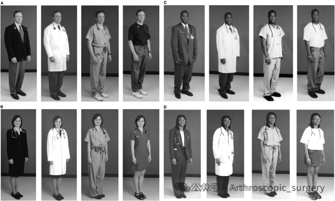 早在2005年就有研究开始关注医生的穿搭,调查发现大家心目中更加偏爱白大褂加职业装的组合(76.3%,P<0.0001),其次是洗手衣(10.2%)、职业装(8.8%)、 和休闲装(4.7%)。02 骨科医生着装调研