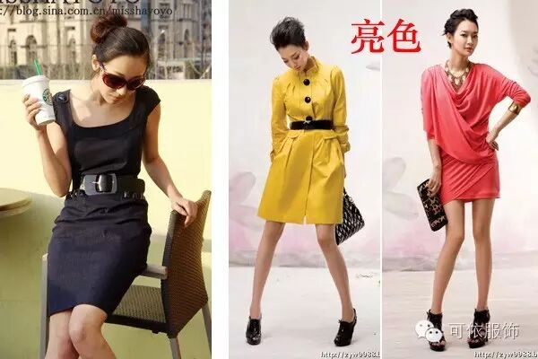 黑与白,哪个颜色会显高?我们发现,黑色会显得更小,它是收缩色的代表,显瘦的同时也会显矮。同样,看看蓝色与红色?我们会发现暖色比冷色显高,相对而言,艳色比浊色显高,暖色比冷色显高,浅色比深色显高。身材娇小的女性适合的色彩搭配方法: