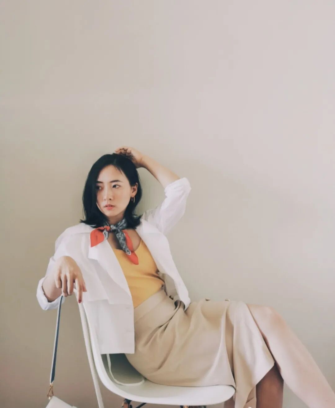 这套造型时尚感更加强烈的秘密还在于腰间的这条丝巾。丝巾不会太浮夸抢眼,在收腰的同时还使整体配色更和谐。