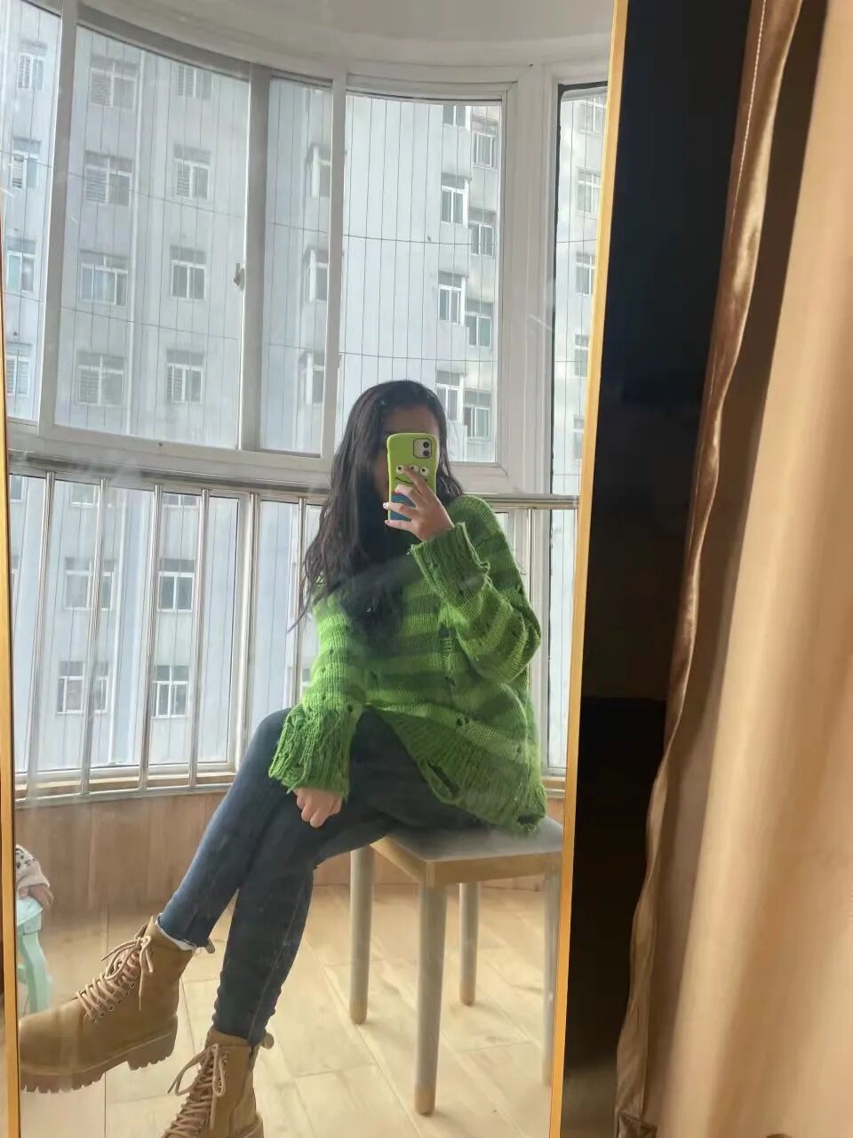 3电气摆景戈绿色毛衣搭配紧身牛仔裤