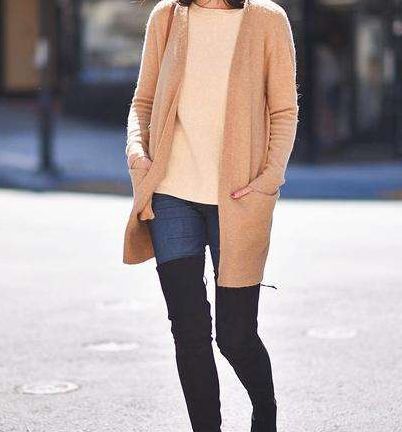 冬季毛衣+短裤的搭配真的是很常见,一款焦糖杏色毛呢短裤为冬季增添温暖感,搭浅色系翻领大衣知性干练,因为下装搭配的是短裤,所以鞋子可以选择长款呢,黑色中长款靴子和大衣搭配也很减龄。