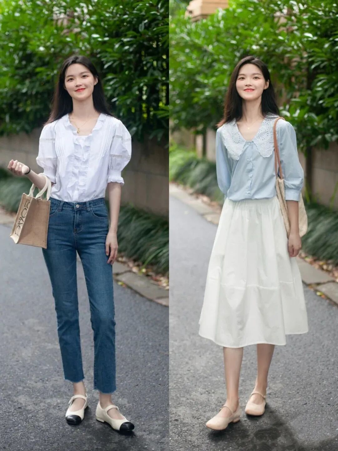 像白色泡泡袖花边衬衫、浅蓝色娃娃领中袖衬衫,怎么穿都灵动时尚。
