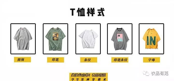 T恤款式有圆领、印花、条纹、印花条纹和字母这几种样式。
