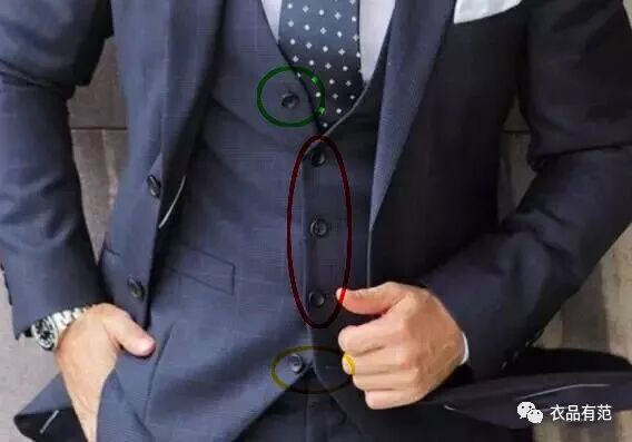 一般来说,马甲都是单排扣居多,扣子3到6粒,没有翻领的设计,前禁下端有两个尖叫设计,有一个说法是马甲的最后一粒扣子不扣,如果只有三粒,全部扣上也可以