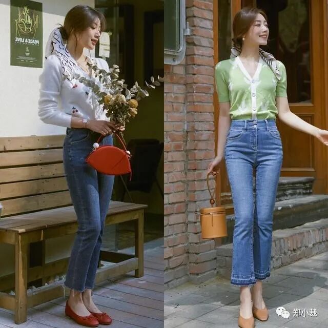 蓝色与白色最为经典,蓝色与绿色尽显清新,牛仔裤的高腰设计,修饰腰线又塑造了大长腿既视感,随意搭配一双平底鞋,微微的露出脚踝,对轻熟女性来说日常通勤都ok,舒适不累脚又美丽大方,不经意间女性的韵味美在悄然散发。