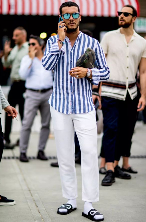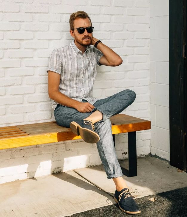 很多人认为亚麻衬衫只有纯色的,甚至只有白色的。其实条纹的亚麻衬衫更能营造出夏日休闲的感觉。同时,条纹自带显瘦的特性对肥胖人士甚是友好。