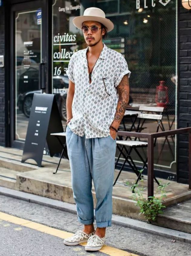 波点衬衫与束带阔腿亚麻休闲裤的组合,再搭配一双平底万斯,裤子是哈伦裤的版型,对于腿部粗壮的男士可以说是非常友好,而且亚麻本身自带的这些皱痕,还成为了装饰方式,带一点点野,也更显得男人味。