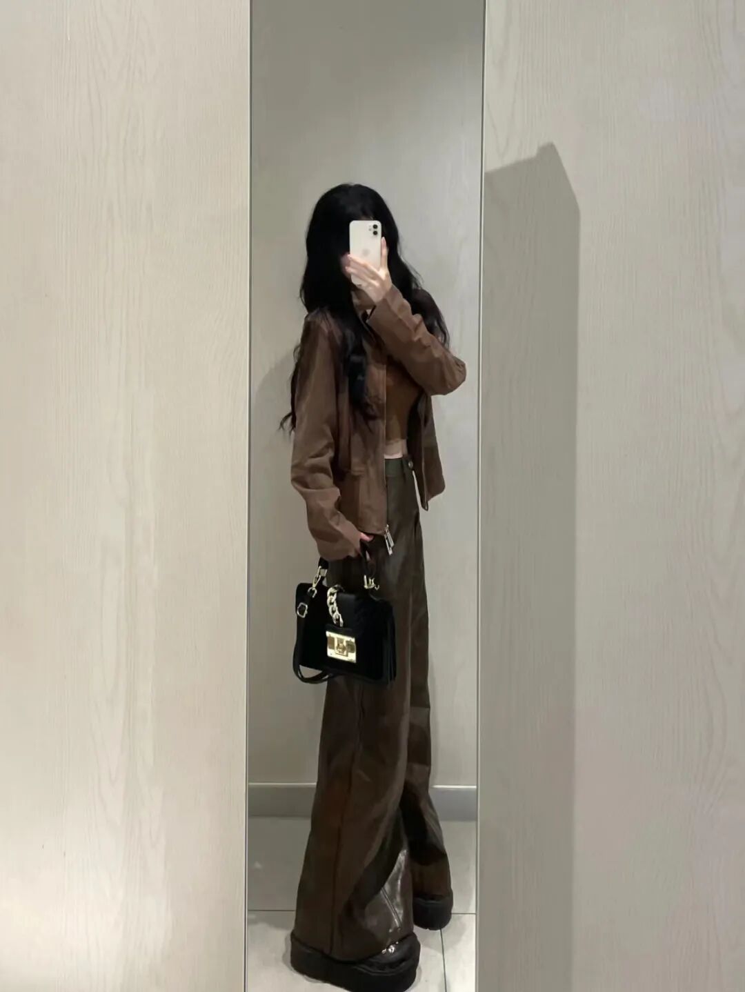 女生的选择也很多皮衣,大衣,毛衣开衫等,且女生的搭配方式更加多样,外套选择皮衣,里面配上修身长袖,下半身选择同色系皮裙,配上靴子就是妥妥的“美拉德辣妹”啦。选择大衣,里面配上衬衫和针织马甲,下面配上牛仔裤或者同色系裙子就是妥妥的“韩系美拉德”啦~