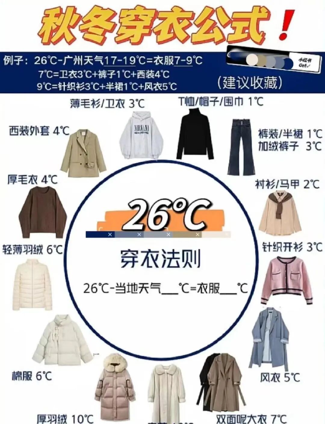 例如:26°C-天气(17-19)C=衣服(7-9)C,即当气在17-19°C时,最舒适的衣服温度是7-9°C每件服能增加的温度:T恤1°C衬衫2°C针织开衫3°C薄毛衫/卫衣3°C西装外套4°C厚毛衣4°C风衣5°C棉服6°C轻薄羽绒服6°C双面呢大衣7°C羽绒服10°C皮草12°C不同的衣服可以根据天气变化,穿搭出最适宜气温的组合。