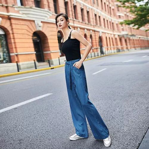二是宽松牛仔裤,通过上紧下松的搭配,来穿出饱满的身材。当然了,想要达到一秒吸睛的效果,可以选择红蓝、黄蓝配色,一秒变年轻靓丽。