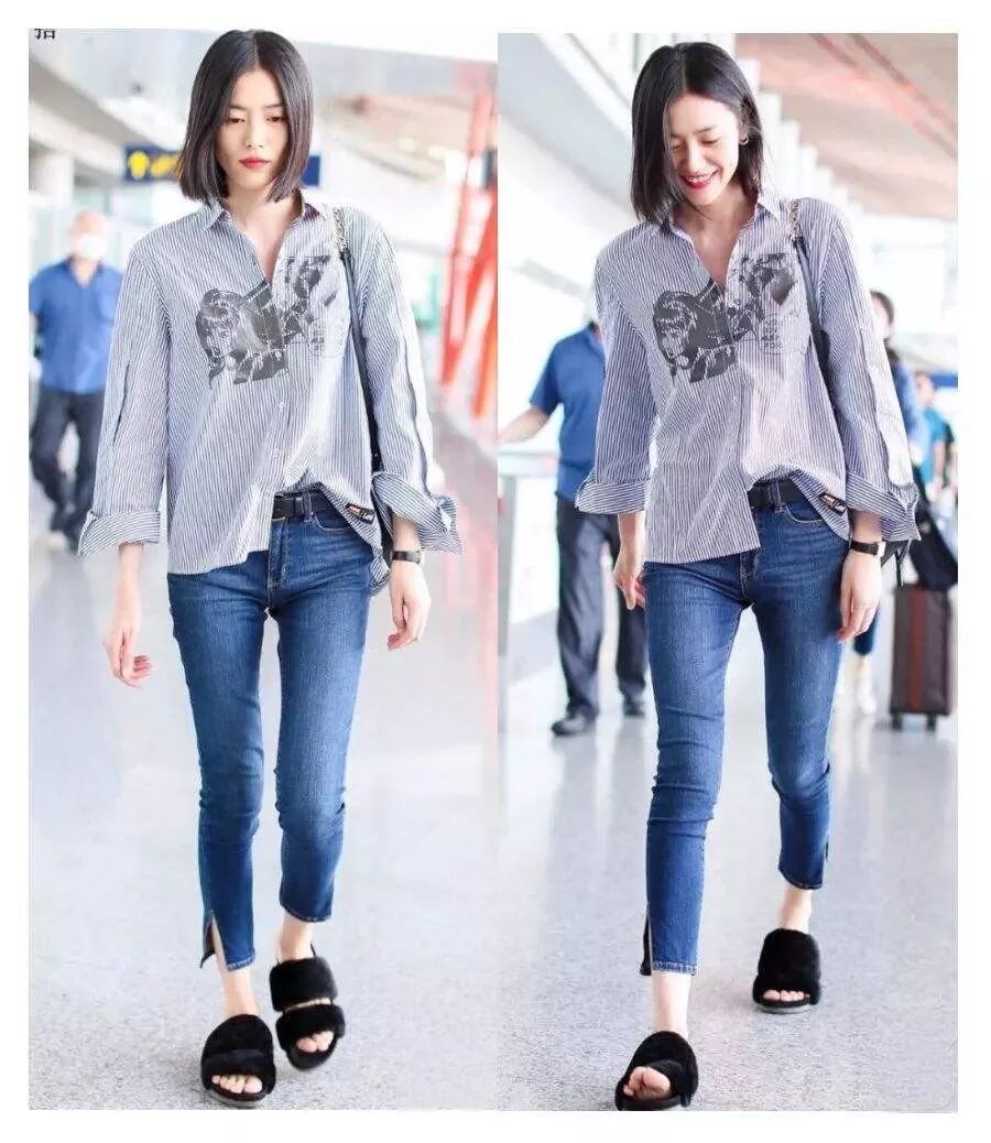 牛仔裤根据版型有两个穿搭方向,一是,紧身的牛仔裤,选择上松下紧的搭配,穿出慵懒随性感;