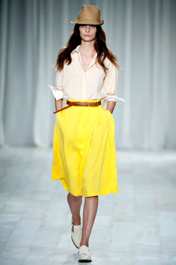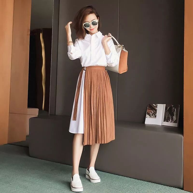 白衬衫搭配阔摆裙会显出女性活泼的性格。阔摆裙的颜色可以选择鲜艳明亮一些的。