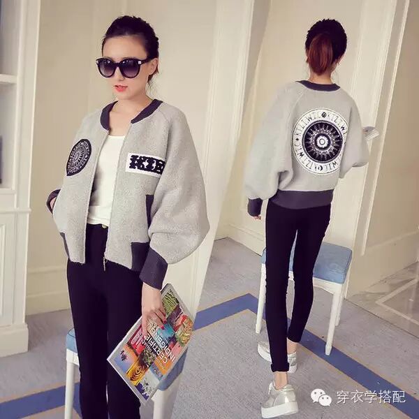 1·棒球服的版型设计,插肩袖,袖子很大,面料很厚实,拿在手里很有分量,颜色也非常洋气,撞色的拼接更显时尚,植绒贴布设计也是一大亮点,简单的搭配就很出彩!