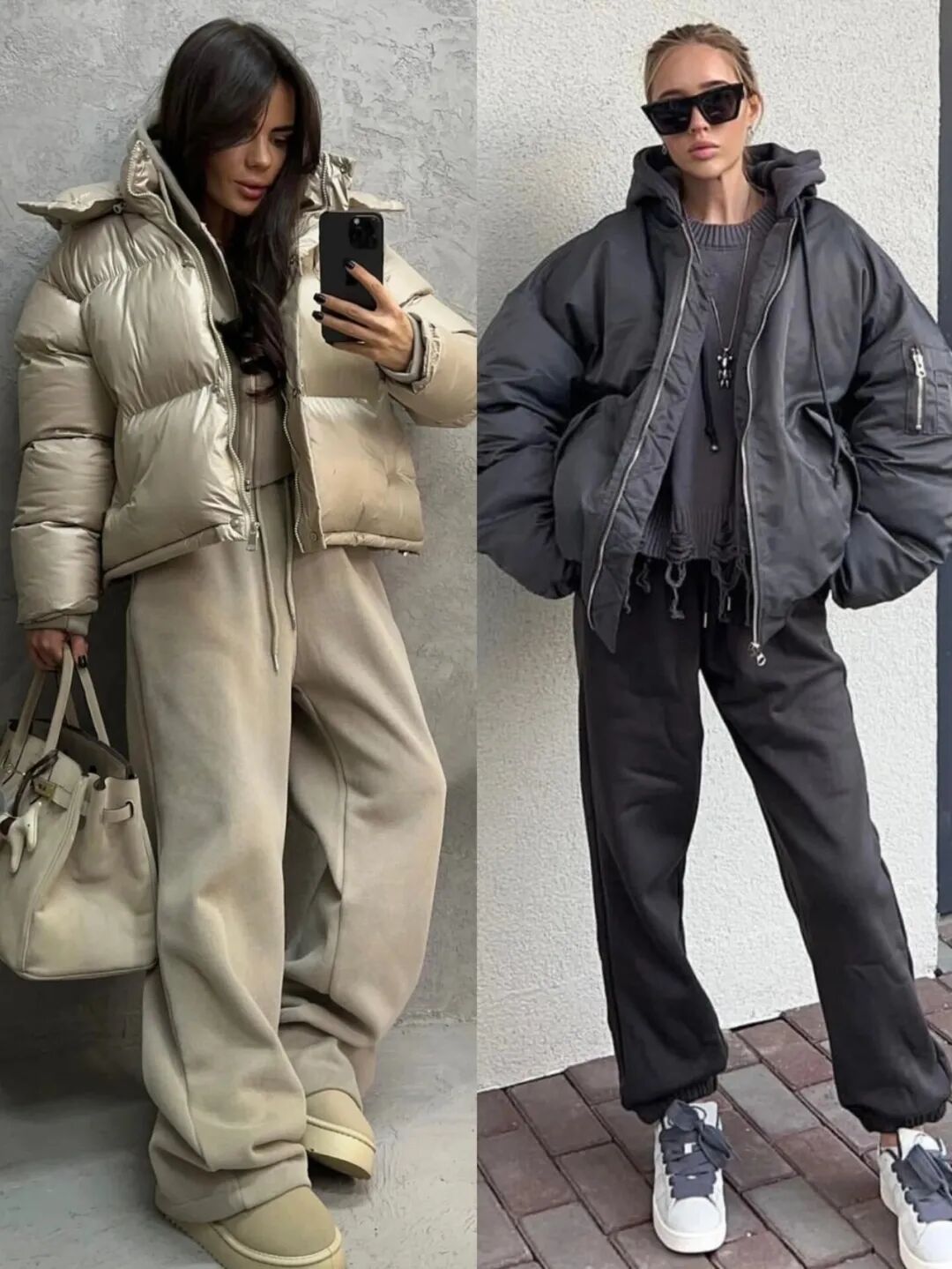 如果你想要更加时尚一些,也可以选择搭配薄款T恤,下半身可以选择卫裤、牛仔裤或者legging,这样不仅可以拉长腰线,减少臃肿感,还能在视觉上给人一种显高显瘦的感觉。